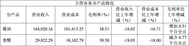 其中,酱油产品在2025年实现营收约16.49亿元,同比下滑16.02%。虽然该品类的毛利率提升了0.51个百分点至38.51%,但依旧难以抵消销量下滑带来的负面影响。