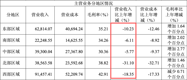 从区域来看,千禾味业的五大销售区域在2025年也是全线下滑。其中,“大本营”西部区域实现营收约9.15亿元,同比下滑18.35%;东部区域实现营收约6.28亿元,同比下滑10.23%;中部区域实现营收约3.93亿元,同比下滑5.77%;北部区域实现营收约3.86亿元,同比下滑31.1%;南部区域实现营收2.22亿元,同比下滑6.11%。