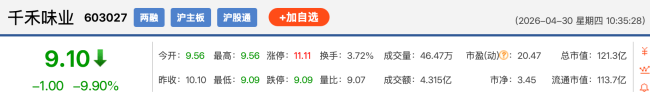 或许是受到业绩颓势的影响,截至4月30日发稿,千禾味业股价大跌9.901%至9.1元/股,公司总市值已经跌至121.4亿元。