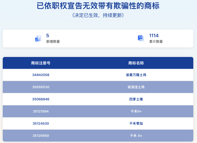 虽然千禾味业近两年的业绩下滑,与舆情有着必然联系。但据国家知识产权局商标局在官网发布争议商标典型案例,在“已依职权宣告无效带有欺骗性的商标”(决定已生效,持续更新)中,“千禾0+”“千禾零加”等商标赫然在列。