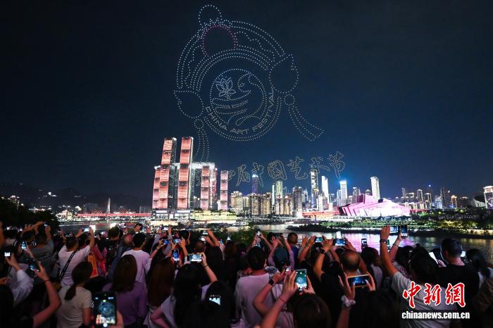 图为无人机表演“第十四届中国艺术节主视觉logo”。中新社记者 何蓬磊 摄 图为市民观看无人机灯光秀表演。中新社记者 何蓬磊 摄