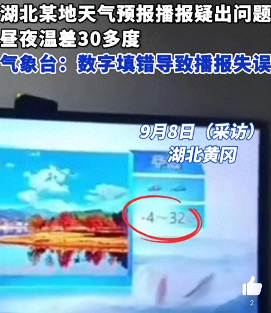 气象台回应天气预报播报失误。9月8日(采访),湖北黄冈,一网友发视频称,9月7日罗田电视台天气预报播报疑似出现问题,最低气温居然出现了零下,昼夜温差30多度。罗田县气象台工作人员回应:数字填错导致播报失误,已对涉事工作人员批评教育,后期会和...