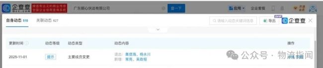 企查查APP显示,11月1日,广东顺心快运有限公司(简称顺心捷达)发生信息变更,黄偲海卸任董事长,常亮接任。