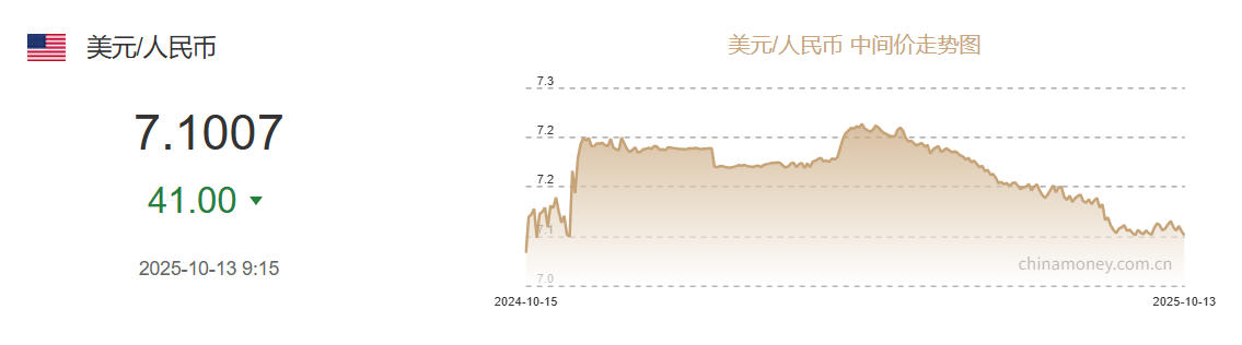 10月13日人民币对美元中间价报7.1007元 上调41个基点
