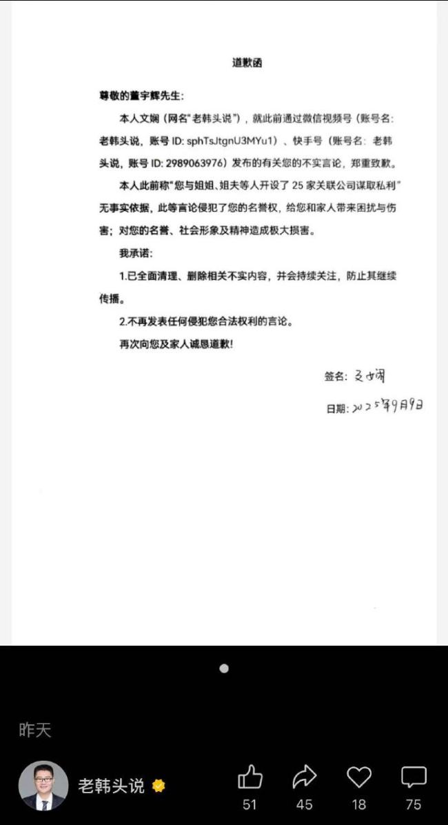9月15日,博主“老韩头说”向董宇辉发布道歉函:本人此前称“您与姐姐、姐夫等人开设了25家关联公司谋取私利”无事实依据,此等言论侵犯了您的名誉权,给您和家人带来困扰与伤害;对您的名誉、社会形象及精神造成极大损害。本人承诺:已全面清理、删除相...