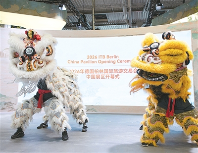演员在2026柏林国际旅游交易会中国展区表演舞狮。 新华社记者张豪夫摄 本报电(杨桐)近日,由中外文化和旅游交流中心联合ITBChina、中国驻法兰克福旅游办事处、柏林中国文化中心共同主办的中