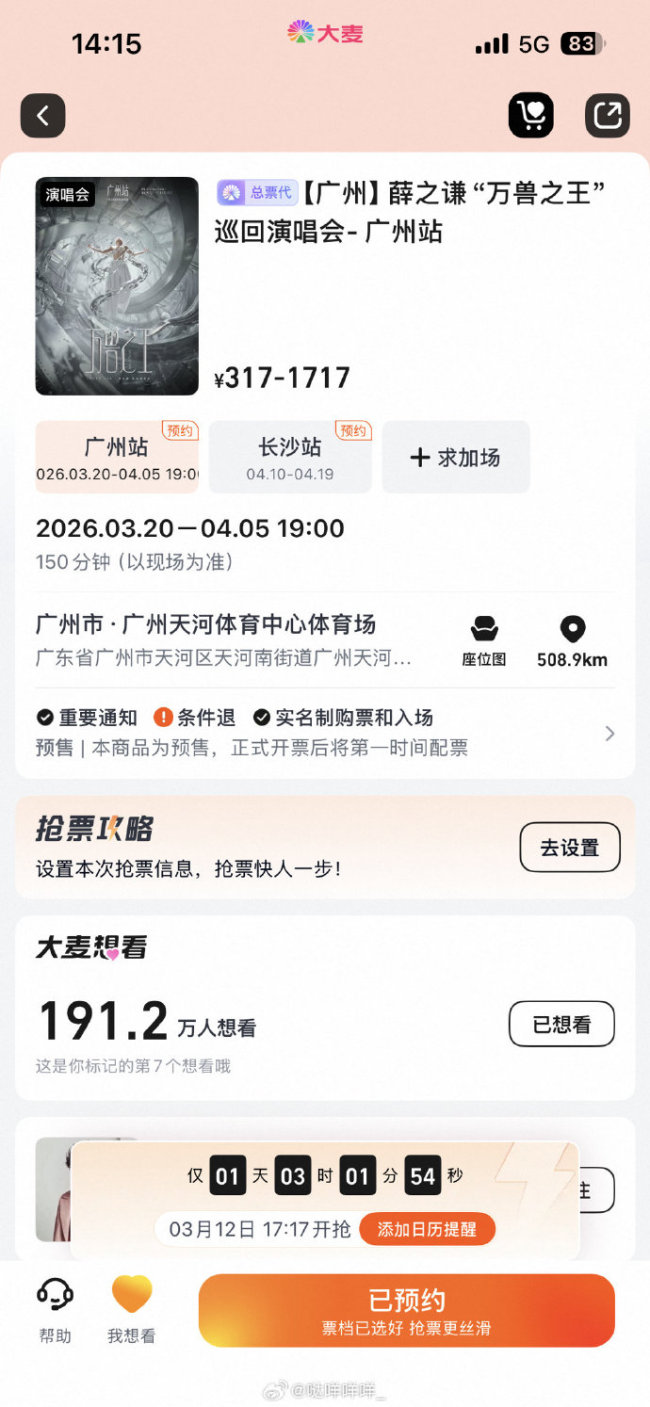 薛之谦"万兽之王"巡回演唱会广州站的二次开票(二开)将于2026年3月12日17:17在大麦等平台启动,9场剩余门票统一开放销售。...