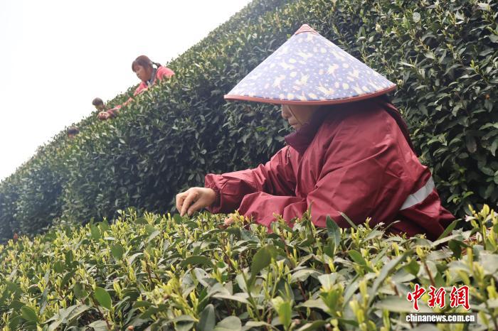 3月19日,杭州市西湖区转塘街道龙坞茶镇,采茶工采摘西湖龙井茶。当日,杭州西湖龙井茶龙井43品种正式开采。中新社记者 鲍梦妮 摄
