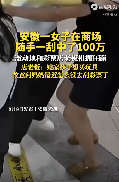 彩票店老板回应女子随手一刮中100万。9月8日发布,安徽芜湖。一女子在商场随手一刮中了100万,激动地和彩票店老板相拥狂蹦,店老板:她家孩子想买玩具,故意问妈妈最近怎么没去刮彩票了。彩票店老板回应女子随手一刮中100万彩票店老板回应女子随手...