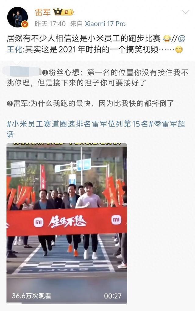 近期,小米员工赛道圈速排名的话题引起了广泛关注,雷军在这次排名中位列第15名。有网友发现了一段视频,显示在冲线前有小米员工假摔,让雷军得第一,并戏称“为什么我跑得最快,因为比我快的都摔倒了”