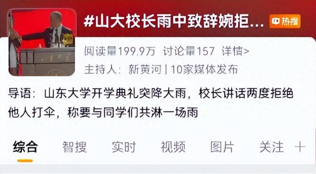 9月28日,话题“山大校长雨中致辞婉拒同学撑伞”登上微博热搜榜,引起广泛关注。此前一天,山东大学在中心校区举行了新生开学典礼。典礼上,校长李术才正在发言时突然下起了大雨。在接近20分钟的讲话过程中,李术才两次拒绝了他人为其撑伞