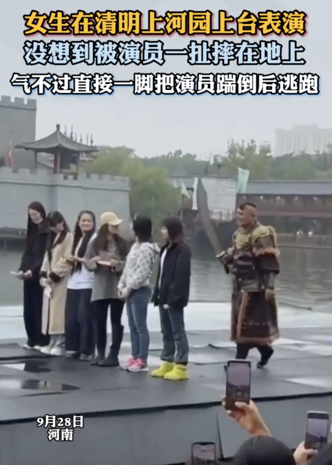 女生上台表演被演员扯摔在地上。女生在清明上河园上台表演,没想到被演员一扯摔在地上,女生气不过起身将演员踹了一脚,撒腿就跑,现场观众大笑!女生上台表演被演员扯摔在地上女生上台表演被演员扯摔在地上女生上台表演被演员扯摔在地上女生上台表演被演员扯...